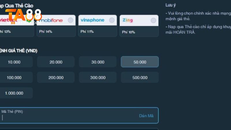 Ta88 hỗ trợ nhiều kênh khác nhau như chuyển khoản ngân hàng, ví điện tử, hoặc nạp bằng thẻ cào điện thoại. Hãy lựa chọn hình thức mà bạn thấy tiện lợi nhất. Hệ thống sẽ hướng dẫn cụ thể từng bước ứng với phương thức bạn chọn, đảm bảo người dùng dễ thao tác ngay cả khi mới sử dụng lần đầu.